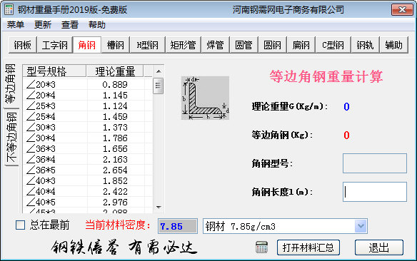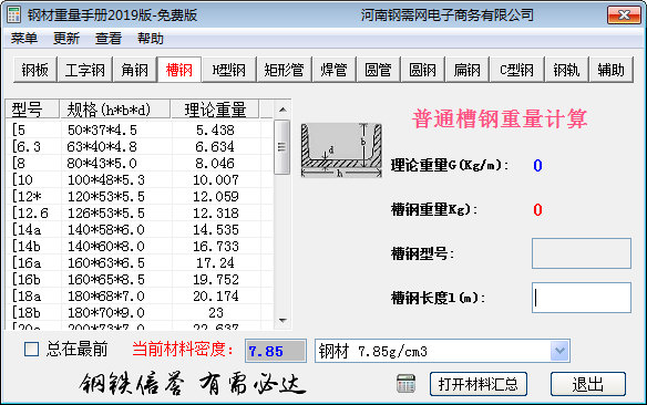鋼材重量計算軟件,其中包含常用鋼板、工字鋼、角鋼、槽鋼、H型鋼、無縫管、鋼管、鋼軌、C型鋼理論重量的計算、磅差處理、金額大寫轉換等功能。