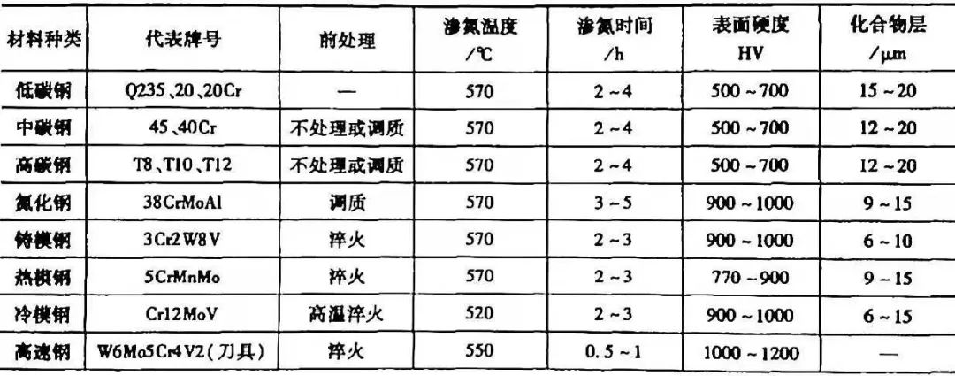 除氣體滲氮方法外,還有固體滲氮、鹽浴滲氮、真空脈沖滲氮、加壓滲氮、流態床滲氮、催化滲氮、電解氣相滲氮、高頻滲氮、短時滲氮等各種因地制宜的滲氮方法。詳見表12 。