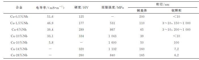 機械合金化法作為一種典型的形變復合工藝,可以增大鈮在銅中的固溶度。機械合金化制備的納米晶Cu-Nb合金是一種兼具高強度、高導電性、良好耐磨性以及抗高溫軟化性能的先進復合材料,具有較廣闊的應用前景。利用機械合金化方法獲得的不同成分Cu-Nb合金的組織與性能如表1所示。關于機械合金化過程中的強化固溶機制以及晶粒細化行為尚有待深入研究。