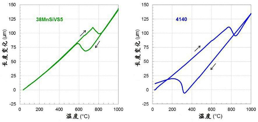 在圖1a和圖1b中,鋼在加熱過程中表現相似,而在冷卻過程中表現則有差異。在加熱過程中,由于它們具有可比的碳含量和起始顯微結構,它們類似地從鐵素體和滲碳體(Fe3C)的混合物轉變為奧氏體。在冷卻過程中,由于合金含量的不同,兩種鋼的表現也有所不同,從而導致4140鋼更易硬化,因此在較低的溫度下發生相變。38MnSiVS5鋼在相對較高的溫度下逆轉了加熱時的相變,從熱處理開始到結束沒有凈尺寸變化。4140鋼在低得多的溫度下轉變,導致馬氏體由奧氏體形成,而不是由鐵素體和滲碳體的混合物形成。熱處理后的4140鋼其開始和結束顯微組織之間的差異導致尺寸變化,該尺寸變化是通過測厚法樣品的最終長度的增加來測量的。當這種尺寸變化均勻地在零件中發生時,可以很容易地在精加工余量變化中加以說明。然而,由于熱梯度引起的尺寸不均勻變化會導致形狀變化,這更難以解決。
