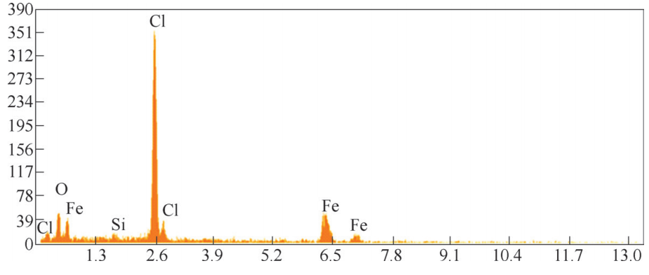 利用能譜儀分析不銹鋼管斷口表面的腐蝕產(chǎn)物,圖5為能譜分析結(jié)果。從衍射峰譜圖上可以直觀地看出,氯含量很高,說明該不銹鋼管處于含氯的腐蝕環(huán)境中。該化肥廠開裂失效鋼管置于露天環(huán)境,廠址地處沿海地帶,距海岸僅1.1km,屬于典型的海洋大氣環(huán)境。在溫度濕度較高時,大量海水蒸發(fā)產(chǎn)生鹽霧現(xiàn)象,致使空氣中含有較高的氯離子,含有氯離子的水分吸附到不銹鋼管的外壁,形成腐蝕性介質(zhì),對不銹鋼管不斷腐蝕。奧氏體不銹鋼在普通大氣環(huán)境中,表面會形成致密的鈍化膜(氧化膜),此鈍化膜隔絕了大氣與不銹鋼表面直接接觸,對不銹鋼具有保護作用,使其具有優(yōu)良的耐腐蝕性能。即使鈍化膜被破壞,也會及時再生、修復(fù)。而氯離子極容易破壞奧氏體不銹鋼的鈍化膜,在表面形成點蝕或蝕坑,加速不銹鋼的腐蝕。