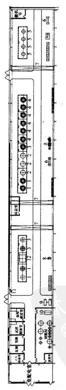 (2) 拖拉機零件熱處理車間工藝平面布置如圖2所示。(3) 重型柴油機廠部件熱處理車間工藝平面布置如圖3所示。(4) 重型柴油機廠大件熱處理車間工藝平面布置如圖4所示。(5) 工程機械可控氣氛熱處理車間工藝平面布置如圖5所示。