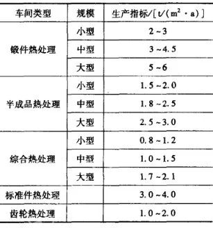 (1) 生產面積指各主要工序、輔助工序及與生產、輔助工序有關的操作所占的面積。如加熱爐、加熱裝置、淬火槽等本身所占用的面積,操作所需的面積及工人在操作時所需的通道面積均屬于生產面積。校直、檢驗所占用面積也算在生產面積內。生產面積約占車間總面積的70%~80%。(2) 輔助面積指服務于生產而不參與主要工作和輔助工作的機構。包括車間配電室、變頻間、電容器間、檢驗室、車間試驗室、保護氣氛制備間、機修間、儀表間、通風機室、油循環冷卻室、輔料庫、主要通道、地下室及車間辦公室、生活間等所占用的面積。輔助面積約占車間總面積的20%~30%。(1) 各類熱處理車間面積指標。各類熱處理車間每平方米總面積生產指標,如表18所示。