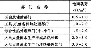 (1) 位置:高頻間及中頻間應單獨設置,其位置應放在車間的上風向和非發展方向的一端,遠離油煙、灰塵和振動較大的設備。(3) 封頂及隔斷:高頻間的封頂高度不低于4.5m, 中頻發電機室的封頂高度一般為5.5~6.0m, 具體視設備大小和單軌軌頂高確定。(4) 門窗:應設置足夠的窗戶,以利采光及自然通風。高頻間及中頻發電機室門的尺寸一般為:2.1mx2.7m。(5) 高頻間屏蔽:高頻間一般采用Φ1mm鋼絲制成5mmx5mm 的鋼絲網,或用0.5~0.6mm厚的鋼板進行屏蔽;門、窗用雙層鋼絲網屏蔽;金屬屏蔽層必須接地,以保安全。凡引入屏蔽間的管道,其四周應與屏蔽層焊牢,并采取措施切斷屏蔽層與管道系統的導電連接。電源必須經過濾波器,然后引人屏蔽間,以抑制通過導線傳播干擾。熱處理車間地面載荷取決于生產設備,可參照表22設計。