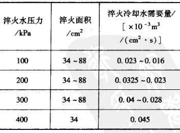(2) 感應淬火用水量。感應淬火用水的常用壓力為200~300kPa, 單位淬火面積單位時間所需淬火冷卻水量指標如表 31所示。