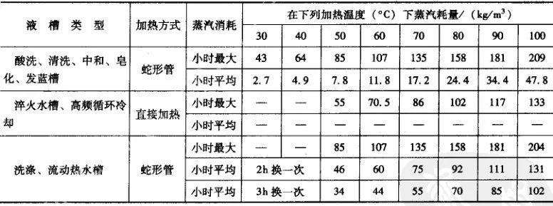 熱處理車間使用蒸汽為飽和蒸汽,常用壓力為200~400kPa.蒸汽的比熱容,一般取較低數值,即2100kJ/kg。表33為各類液槽蒸汽消耗量的概略計算指標。
