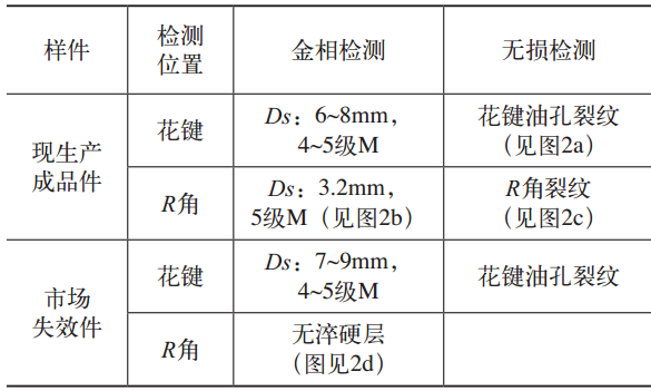 對現生產成品件和市場反饋的失效件進行無損檢測和金相分析,試驗結果見表1。從表中可以看,出現生產成品件以及市場失效件花鍵部位的感應淬火結果滿足技術要求,花鍵部位有效淬硬層深≥5mm,淬硬層金相組織為4~5級針狀馬氏體。但花鍵油孔處和R角處的感應淬火結果均不符合技術要求,具體如下:1)現生產成品件的R角位置和花鍵油孔處存在感應淬火裂紋。2)R角處的感應淬火層深較淺甚至存在無感應淬火層深現象,未達到技術要求所規定的5mm以上。