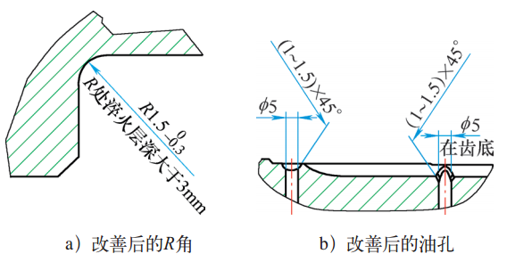 由以上分析可知,副箱輸出軸斷裂的根本原因在于R角結構及油孔倒角設計不合理,因此特制定以下改善措施。1)改進過渡圓角結構為外圓角R1.5mm,優化圓角處感應淬火層深技術要求為≥3mm。2)改進油孔倒角結構為(1~1.5)mm×45°。圖4a所示為優化后的R角結構,在感應熱處理中,當工件的臺階根部需要進行感應淬火強化時,臺階根部需要有過渡圓角,且越大越好。如此設計有良好的工藝性:①減小臺階根部的應力集中,降低使用過程中的開裂傾向。②降低感應淬火難度,臺階根部受熱均勻,臺階淬硬層均勻連續,強度顯著提升。圖4b所示為優化后的油孔倒角設計,倒角尺寸增大到(1~1.5)mm×45°,同等加熱情況下,油孔倒角越大,越可顯著減小油孔邊緣的電流密度,降低因過熱而使油孔邊緣開裂的傾向。