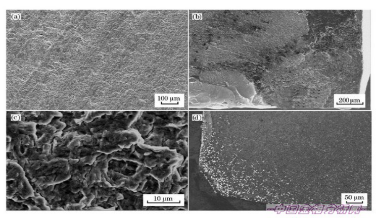 1.疲勞:金屬材料在應力或應變的反復作用下發生的性能變化稱為疲勞。 2.疲勞斷裂:材料承受交變循環應力或應變時,引起的局部結構變化和內部缺陷的不斷地發展,使材料的力學性能下降,最終導致產品或材料的完全斷裂,這個過程稱為疲勞斷裂,也可簡稱為金屬的疲勞。引起疲勞斷裂的應力一般很低,疲勞斷裂的發生,往往具有突發性、高度局部性及對各種缺陷的敏感性等特點。 No.2 疲勞斷裂的分類 1.高周疲勞與低周疲勞 如果作用在零件或構件的應力水平較低,破壞的循環次數高于10萬次的疲勞,稱為高周疲勞。例如彈簧、傳動軸、緊固件等類產品一般以高周疲勞見多。 作用在零件構件的應力水平較高,破壞的循環次數較低,一般低于1萬次的疲勞,稱為低周疲勞。例如壓力容器,汽輪機零件的疲勞損壞屬于低周疲勞 。 2.應力和應變分析 應變疲勞——高應力,循環次數較低,稱為低周疲勞; 應力疲勞——低應力,循環次數較高,稱為高周疲勞。 復合疲勞,但在實際中,往往很難區分應力與應變類型,一般情況下二種類型兼而有之,這樣稱為復合疲勞。 3.按照載荷類型分類 彎曲疲勞、扭轉疲勞、拉壓疲勞、接觸疲勞、振動疲勞、微動疲勞。 No.3 疲勞斷裂的特征 宏觀:裂紋源→擴展區→瞬斷區。 裂紋源:表面有凹槽、缺陷,或者應力集中的區域是產生裂紋源的前提條件。 疲勞擴展區:斷面較平坦,疲勞擴展與應力方向相垂直,產生明顯疲勞弧線,又稱為海灘紋或貝紋線。 瞬斷區:是疲勞裂紋迅速擴展到瞬間斷裂的區域,斷口有金屬滑移痕跡,有些產品瞬斷區有放射性條紋并具有剪切唇區。 微觀:疲勞斷裂典型的特征是出現疲勞輝紋。 一些微觀試樣中還會出現解理與準解理現象(晶體學上的名稱,在微觀顯象上出現的小平面),以及韌窩等微觀區域特征。 No.4 疲勞斷裂的特點 (1)斷裂時沒有明顯的宏觀塑性變形,斷裂前沒有明顯的預兆,往往是突然性的產生,使機械零件產生的破壞或斷裂的現象,危害十分嚴重。 (2)引起疲勞斷裂的應力很低,往往低于靜載時屈服強度的應力負荷。 (3)疲勞破壞后,一般能夠在斷口處能清楚地顯示出裂紋的發生、擴展和最后斷裂的三個區域的組成部分。 No.5 案例分析 廣東某摩托車廠一輛摩托車在運行了2000km后發生機械故障,經拆機檢查,發現發動機曲軸連桿斷裂。據悉該連桿材料為20CrMnTi,表面經過滲碳處理。連桿工作原理見圖1,連桿的往返運動帶動兩傳動曲軸轉動。20CrMnTi是合金結構鋼,含碳量0.2%左右,含錳1%左右,含鈦1%左右。這種材料一般做軸類零件,要求滲碳。 圖1 1.宏觀檢查 失效連桿件有兩個斷口在連桿斷裂端的軸承弧面可見許多與斷口平行的裂紋[圖3(a)];斷裂端一側面存在強烈磨擦痕跡[圖3(b)],磨損深度0.5mm;軸承弧面靠近磨擦側面一端可見藍灰色的高溫氧化痕跡[圖3(c)] 。斷口1較為光滑平整,斷口邊緣已磨損,中部可見疲勞弧線[圖3(d)];斷口2未見疲勞弧線。 圖2 圖3 2.掃描電鏡分析 斷口1在掃描電鏡下顯示疲勞弧線[圖4(a)];根據弧線的走向可以找到疲勞源,疲勞源在[圖4(d)]右上方拐角處,局部放大,源區的細微組織大部分已磨損,但能看到放射棱特征[圖4(b)];在疲勞擴展區可見疲勞條紋及二次裂紋[圖4(c)];斷口2未見疲勞條紋,只有韌窩,可見斷口1是最先開始斷裂的斷口,而斷口2是二次斷口。 圖4 3.化學成分 在連桿身部位取樣,進行化學成分(質量分數,%)分析,結果符合GB/T3077—1999 20CrMnTi的化學成分要求 。 4.結果分析 綜合上述檢驗結果,失效件材料化學成份符合技術條件要求。 連桿斷裂端一側面出現非正常嚴重磨擦現象,軸承弧面靠近磨擦面一端出現的藍灰色的氧化膜,是黑色氧化鐵(Fe3O4)及紅色氧化鐵(Fe2O3)的混合體,其形成溫度在400℃以上。表明該連桿與一輸出軸之間的磨擦導致該區域溫度過熱。 斷口掃描電鏡分析表明斷口疲勞裂紋源在氧化膜附近的拐角處,正處于高溫區域。表面氧化會使裂紋產生的機會增加,同時高溫提高了蠕變損傷的可能性。另一方面磨擦導致金屬表面粗糙,容易形成表面應力集中,增大疲勞源產生的可能性。 斷裂起源往往發生在拉應力最大的層面上。從連桿運動受力情況分析,斷口1的斷面所受的拉應力最大,容易在此斷面靠近磨擦面的拐角處形成裂紋源。同時由于該區域存在較粗大的狀碳化物,破壞了基體組織的連續性,加速了裂紋的形成和擴展,降低了疲勞強度,最終導致了疲勞斷裂。 連桿滲碳表面的碳化物過大與滲碳工藝不當有關。粗大的塊狀碳化物主要是由于碳濃度過高造成的,特別容易在工件尖角處形成,導致零件壽命顯著下降。因此在滲碳過程中應注意嚴格控制滲碳氣氛的碳勢,以免過高的碳勢引起工件表面形成粗大的碳化物。 5.結論 曲軸連桿斷裂屬疲勞斷裂,引起斷裂的原因是在使用時連桿受到劇烈磨擦,導致局部區域應力集中及溫度過高,降低了材料的疲勞強度。連桿拐角處表面的較大塊狀碳化物加速了裂紋的萌發及擴展。 6.改進 設計時減少摩擦處的粗糙度,可以減少應力集中,降低零件的疲勞強度 。同時減少摩擦帶來的高溫,減少了蠕變損傷的可能性。 改善滲碳工藝,連桿滲碳表面的碳化物過大與滲碳工藝不當有關。粗大的塊狀碳化物主要是由于碳濃度過高造成的,特別容易在工件尖角處形成,導致零件壽命顯著下降。因此在滲碳過程中應注意嚴格控制滲碳氣氛的碳勢,以免過高的碳勢引起工件表