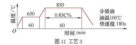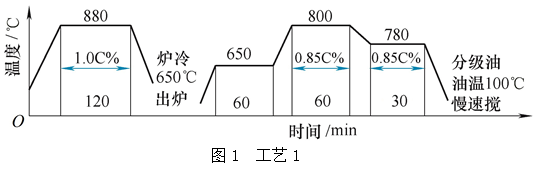 工藝1曲線如圖1所示,使用設(shè)備是天龍生產(chǎn)的多用爐,型號為RM9-75/130/75-5-TL。淬火冷卻介質(zhì)使用北京華立精細(xì)化工公司今禹等溫分級淬火油,型號Y35-Ⅱ。