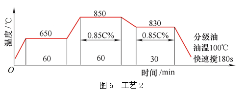 工藝1曲線如圖6所示,使用設(shè)備為天龍生產(chǎn)的多用爐,型號:RM9-75/130/75-5-TL。淬火油使用的是北京華立精細(xì)化工公司今禹等溫分級淬火油,型號Y35-Ⅱ。