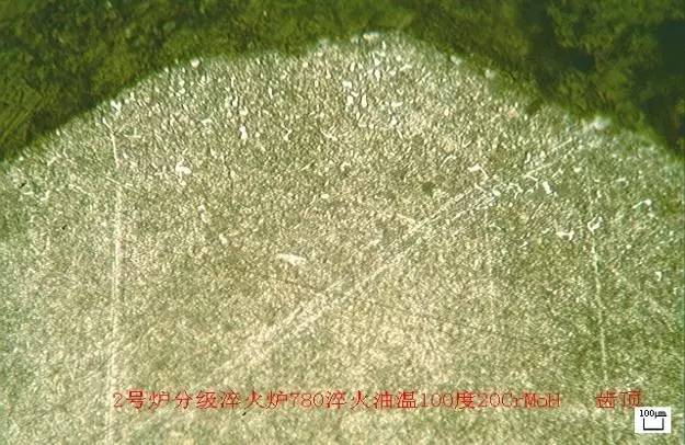 在此之前我們曾經(jīng)在分級油中試驗(yàn)過模數(shù)為3~3.5mm的行星輪,工藝為強(qiáng)滲溫度900℃,淬火溫度為800℃,結(jié)果都能滿足客戶要求,故在生產(chǎn)模數(shù)為1.72mm的太陽輪時(shí)為了在滿足產(chǎn)品圖要求的同時(shí)進(jìn)一步減小熱處理變形,將淬火溫度降至780℃后,結(jié)果出現(xiàn)了第三段中所述的問題。