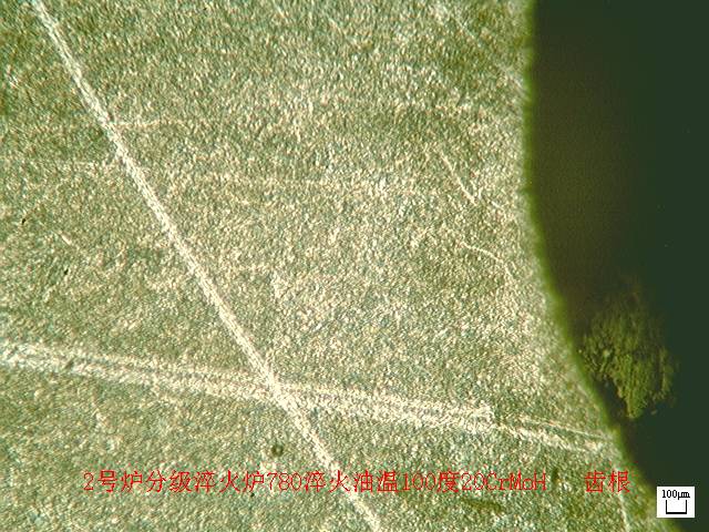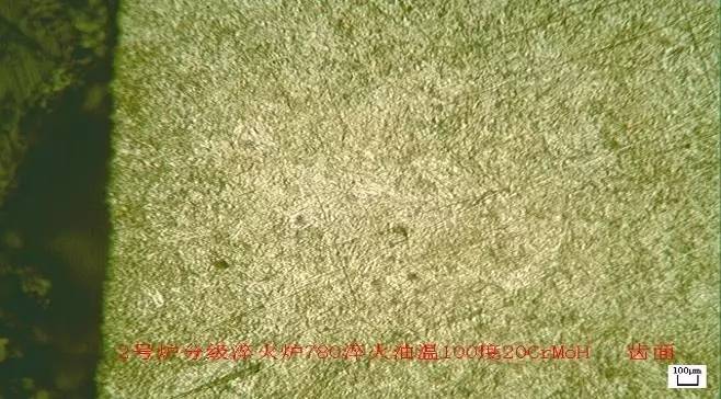 經(jīng)過此次生產(chǎn),我們認(rèn)為小模數(shù)滲碳淬火產(chǎn)品,淬火溫度的控制應(yīng)謹(jǐn)慎,不能一味的為滿足心部硬度而降低淬火溫度,一定要考慮小模數(shù)產(chǎn)品出爐過程中由于結(jié)構(gòu)的原因溫降過快對心部硬度和組織的影響。