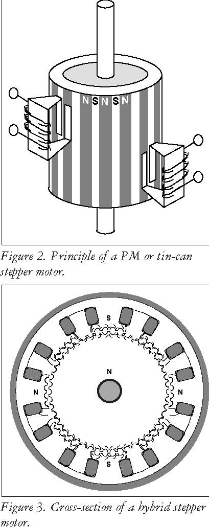 The two most commonly used types of stepper motors are the permanent magnet and the hybrid types. If a designer is not sure which type will best fit his applications requirements he should first evaluate the PM type as it is normally several times less expen-sive. If not then the hybrid motor may be the right choice.
