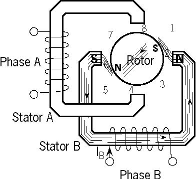 Figure 5 shows the magnetic flux path developed when phase B is ener-gized with winding current in the direction shown. The rotor then aligns itself so that the flux opposition is minimized. In this case the motor would rotate clockwise so that its south pole aligns with the north pole of the stator B at position 2 and its north pole aligns with the south pole of stator B at position 6. To get the motor to rotate we can now see that we must provide a sequence of energizing the stator windings in such a fashion that provides a rotating magnetic flux field which the rotor follows due to magnetic attraction.