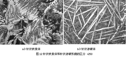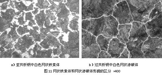 鋼鐵材料組織形態與材質、工藝、性能之間關系的研究是人們百年來為之努力不懈的一大課題。 而組織形貌的識別、分析(即金相分析)是一門實踐性很強的學科,需要實踐經驗及借鑒、參考。 但是,由于很多材料不同處理狀態的顯微組織非常相似,比如網狀鐵素體和網狀二次滲碳體、針狀鐵素體和針狀滲碳體、馬氏體及其回火產物(回火馬氏體、回火托氏體、回火索氏體)、未溶鐵素體和先共析鐵素體、淬火托氏體和回火托氏體、鐵素體和殘余奧氏體、低碳板條馬氏體和羽毛狀上貝氏體、高碳片狀馬氏體和針狀下貝氏體等等。 盡管電子顯微鏡能準確判斷并區分,但生產實際要求的快速檢驗往往不允許,這就給顯微組織的檢驗工作帶來一定困難。如何利用光學顯微鏡、硬度計等常規儀器,準確快速地判斷顯微組織就顯得尤為重要。 其實很多顯微組織只要認真仔細的觀察比對,會在光鏡下發現其獨立的特征。 長期的觀察表明,充分利用光學顯微鏡、硬度計等普通裝備,在理論分析和相互比較的基礎上,快速準確地鑒別不同材料或同種材料不同處理狀態下的顯微組織是可行的,而且有很強的現實性和可操作性。 以下是鋼材中常見的幾種相似顯微組織及其鑒別方法,希望能給予從事金相檢驗教學及生產檢驗的金相工作者以幫助。 鐵素體與滲碳體的鑒別 鋼材在熱加工過程中,往往會出現網狀鐵素體和網狀二次滲碳體以及針狀鐵素體和針狀滲碳體。 如果奧氏體晶粒較大,含碳量較高,冷卻速度較慢時,先共析鐵素體沿奧氏體晶界呈網狀析出;如果奧氏體晶粒粗大,冷卻速度適中,碳的質量分數在0.15%~0.5%范圍內的鋼,先共析鐵素體沿某些晶面析出,呈片狀或(針狀),這種組織稱為魏氏組織。 在過共析鋼中先共析滲碳體的形態一般是網狀或片狀(針狀),無塊狀滲碳體。網狀滲碳體同樣是冷卻速度較慢時形成的,而針狀滲碳體(即魏氏組織)是碳的質量分數為1.1%并在適當的冷速下產生的。 先共析鐵素體和先共析滲碳體在4%的硝酸酒精溶液侵蝕后都是白色。可用以下方法鑒別兩種形態比較相似的白色網狀(或針狀)鐵素體和滲碳體組織。 1.顯微觀察法 如果白色網狀組織比較粗大,粗細不均勻,還能清楚看到網狀組織中黑色細而均勻的線條(即晶界),可以判斷該組織為鐵素體,材料為亞共析鋼,如圖11a所示為45鋼Φ13.2mm棒料橫截面中的組織,由白色網狀鐵素體和索氏體組成;如果白色網狀組織很細很均勻,則可判斷為網狀二次滲碳體,材料為過共析鋼,如圖11b所示為T12鋼完全退火后的組織,由沿晶界析出的白色網狀二次滲碳體和片層狀珠光體組成。 ▼ 2.顯微硬度法 這種方法適用于較粗大的白色網狀情況。一般選用較小載荷的顯微硬度測量,所測之值在600HV以上者可確定為滲碳體相;所測之值在200HV以下者則確定為鐵素體,并可判定認為是亞共析鋼。 3.化學試劑浸蝕法 對于細網狀組織,采用堿性苦味酸鈉水溶液,將被測試樣浸入其中煮沸5min左右,取出試樣以流水沖洗干凈,然后吹干,放在顯微鏡下觀察,若白色網變為黑棕色或更深的黑色,則確定為滲碳體相;若其顏色不變仍呈白色(不受侵蝕),則認為是鐵素體。 4.硬針刻劃法 這是最簡單易行的一種方法。只要有一臺光學金相顯微鏡就可進行。 首先將樣品制成金相試樣,并進行普通的侵蝕,然后在其上刻劃一條痕跡,放到顯微鏡下觀察,若刻劃的痕跡變粗,則認為白色為鐵素體。反之刻痕較細或方向發生變化,則認為是滲碳體相,如圖12a所示為T8鋼1200℃加熱保溫5min20s,先700℃等溫2.5min再600℃等溫2min后水淬的組織,由于淬火加熱溫度特別高,使T8鋼產生了嚴重的脫碳,在隨后的冷卻過程中得到了白色網狀和針狀鐵素體、深色托氏體及針狀鐵素體間的灰色板條狀馬氏體;如圖12b所示為T12鋼1150℃滲碳后正火的組織,為粗大白色針狀和網狀滲碳體及深色索氏體。 ▼