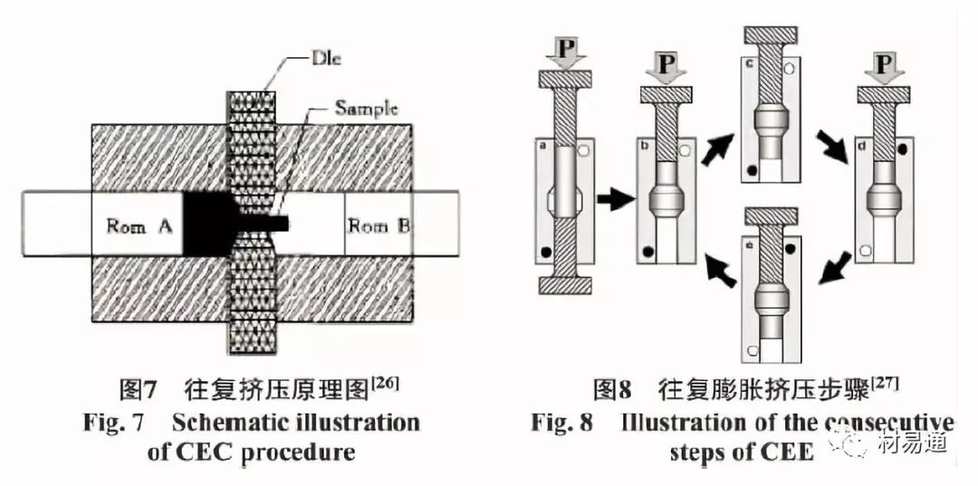 往復擠壓技術(Cyclic Extrusion Compression, CEC)的基本原理:模具由兩個模腔、一個緊縮區和放置于兩模腔內的沖頭構成。兩模腔截面積相等,在同一條軸線上,通過中間的緊縮區連接。在擠壓過程中,試樣在沖頭的作用下,到達緊縮區,試樣將受到正擠壓變形,擠壓后的試樣在另一個模腔的沖頭作用下,發生鐓粗變形。然后另一邊沖頭將試樣按上述過程反向亞輝,完成一個擠壓循環,重復以上過程,直至獲得所要的應變為止,這時移去一測沖頭,就可以將試樣擠出成型。材料經過往復來回的擠壓和壓縮,產生很大的應變,從而得到超細、等軸的超細晶組織。