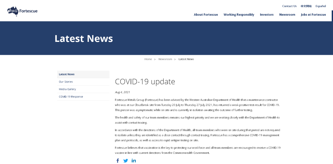 2021年8月4日,Fortescue Metals Group (下文簡(jiǎn)稱FMG) 官網(wǎng)發(fā)布新聞稿,披露了已收到西澳大利亞州衛(wèi)生部的通知,其斷云礦區(qū)維修保養(yǎng)承包商的一名員工新冠檢測(cè)結(jié)果呈弱陽(yáng)性。