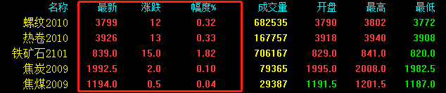 今日期貨震蕩收漲,期螺漲12收報3799,期卷漲13收報3926,鐵礦石漲15收報839,焦炭漲2收報1992.5,焦煤漲0.5收報1194。