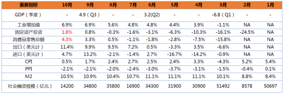 觀察國內經濟恢復情況,可以發現10月宏觀數據整體要好于9月,增強了市場對四季度經濟恢復的信心。國家統計局數據顯示,10月固定資產投資和消費品零售總額同比增速分別達到1.8%和4.3%,較9月回升1個百分點,反映出當前投資和消費的加快,經濟穩步復蘇的趨勢仍將延續,鋼材需求釋放具有較強的韌性。