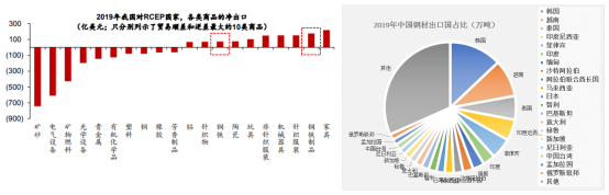 從對鋼鐵行業影響來看,鋼鐵和鋼鐵制品屬于我國對RCEP國家凈出口前10類商品。我國鋼材直接出口國家主要集中在東南亞地區,包括韓國、越南、泰國、菲律賓等國均是RCEP的重要國家,有利于鋼材下游制造業出口的推進,和制造業零部件進口成本的降低。促進制造業產業鏈的優化,推進鋼鐵行業提質增效,以及促進鋼材的直接和間接出口,外需拉動將進一步增強。