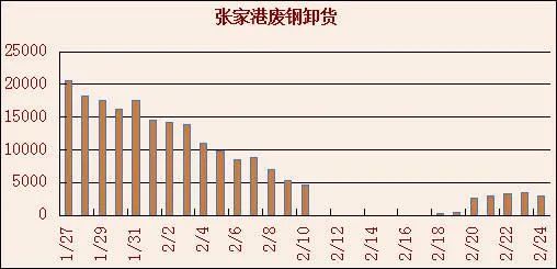 張家港廢鋼卸貨數據來看,年前逐漸進入春節,廢鋼到貨持續減少;而節后商家送貨的積極性仍不高,目前已到正月十四,廢鋼卸貨量始終在3000噸/天徘徊,并且小編聯系幾個江蘇的主要客戶,這幾天還不會太多的發運計劃,也就是說,張家港的到貨量預計不會有太大的提升。