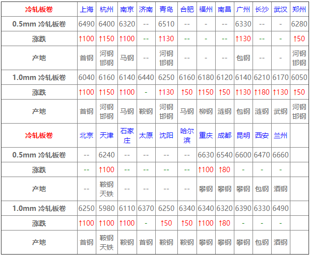 今全國冷軋穩中偏強,幅度50-100,熱卷期貨高開高走,商家心態轉強,現貨市場價格拉漲,操作上仍以出貨為主,終端現以觀望為主,部分地區尚有成交,市場整體成交稍有好轉;