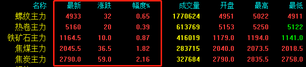 今日期鋼漲幅持續收窄,影響現貨成交及報價心態。期螺上漲32收報4933,期卷上漲20收報5160,鐵礦石上漲10收報1164.5,焦煤上漲36.5收報2045.5,焦炭上漲59收報2790。