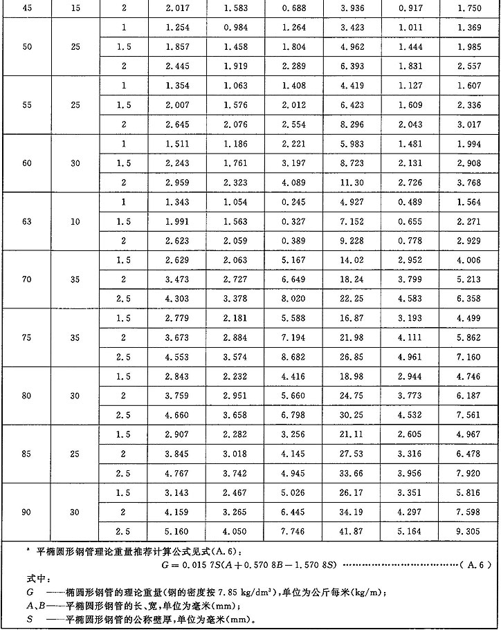 表A.3 橢圓形鋼管的尺寸、理論重量和物理參數
